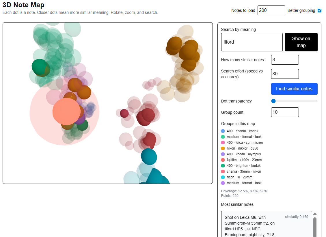 I loaded it with a nerdy dataset: about a thousand short notes describing photgraphs I’ve taken; from the equipment used (camera, lenses, film stocks), locations, subjects, right down to exposure settings. Each note becomes a little ball in space. Balls close together mean they're similar, making the whole thing intuitive and human. Check out the screenshot; a tiny galaxy of camera gear.